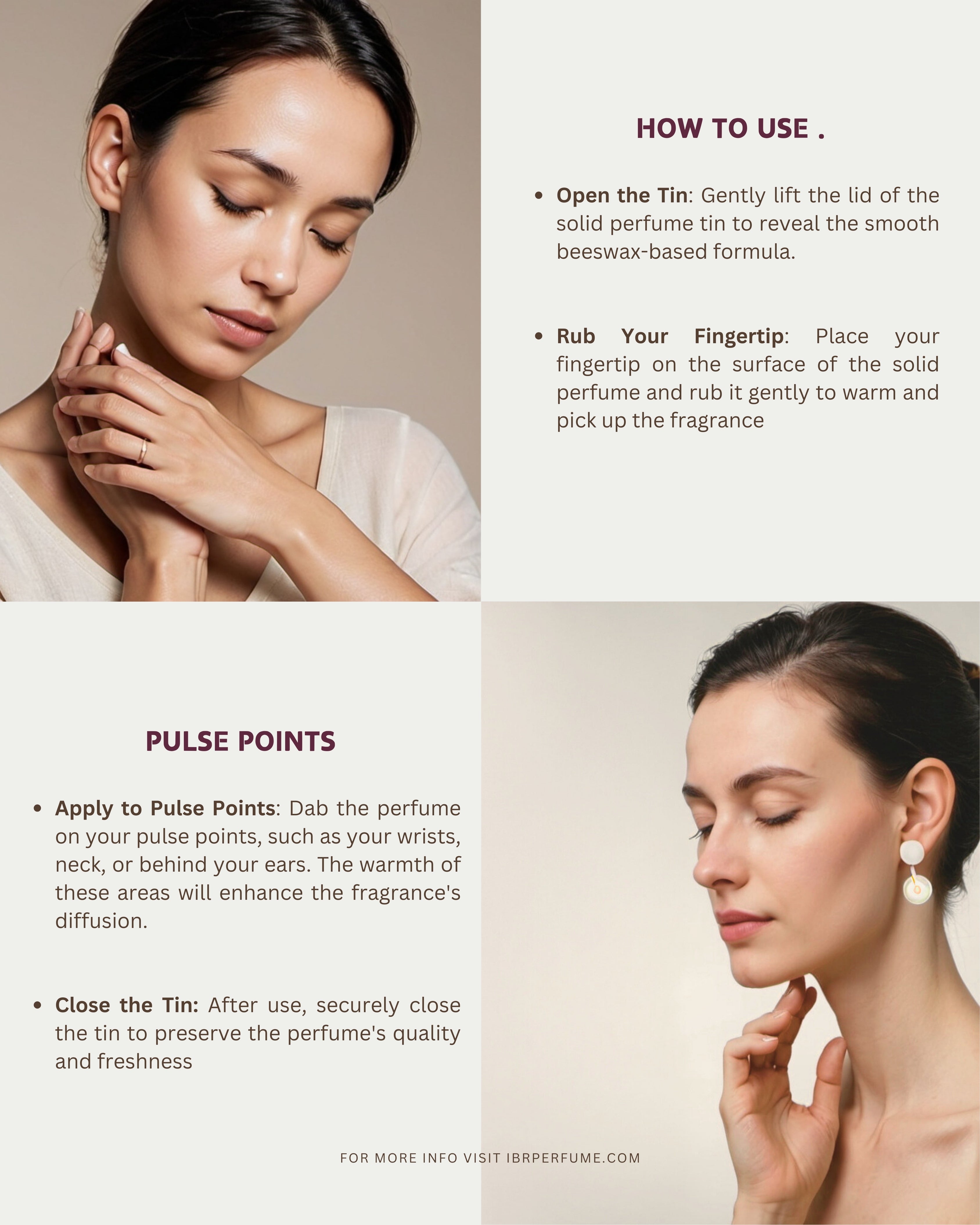 Apply perfume to your pulse points, such as the wrists, neck, behind the ears, and inner elbows. These areas emit heat, which helps to diffuse the fragrance. Avoid rubbing your wrists together after applying perfume, as this can break down the scent molecules and alter the fragrance.